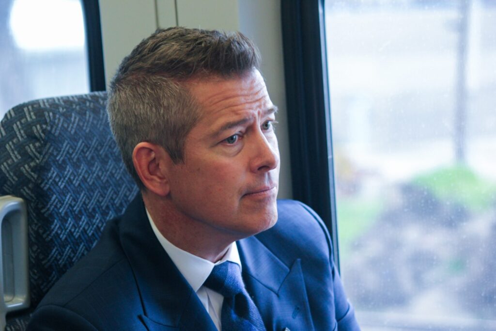 U.S. Secretary of Transportation Sean Duffy rides on a FrontRunner train in Salt Lake City during a media event on Monday, April 7, 2025. (Photo by McKenzie Romero/Utah News Dispatch)