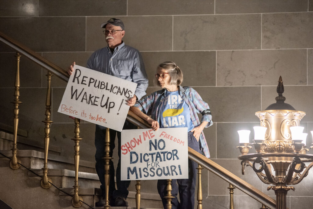 David Fortel and Hope Tinker hold homemade signs during a protest last week in the Missouri Capitol rotunda (Annelise Hanshaw/Missouri Independent).