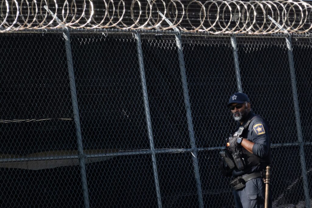 A police officer stands watch as activists protest outside of an Immigration and Customs Enforcement facility on Sept. 5, 2025 in Broadview, Illinois. Immigrants without legal status who have been detained undergo processing at the facility. (Photo by Scott Olson/Getty Images)