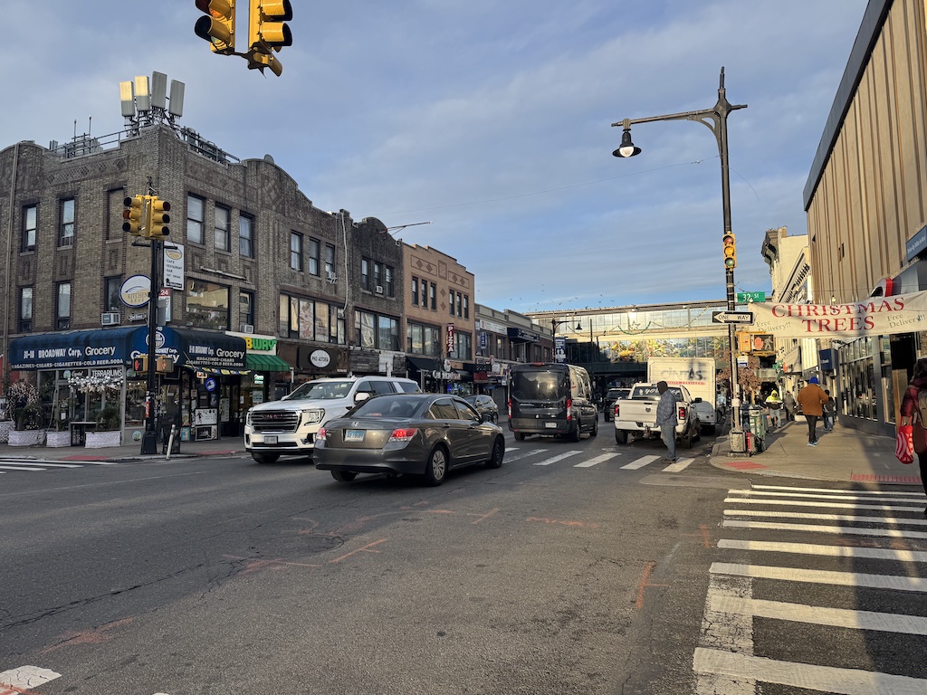 NEW YORK — On a frigid December morning along busy Broadway in the Astoria neighborhood of Queens, New York, pedestrians walk rapidly toward the subway. Cars and e-bikes speed along a busy two-lane road and blast through sharp turns during the early rush to get to the office.