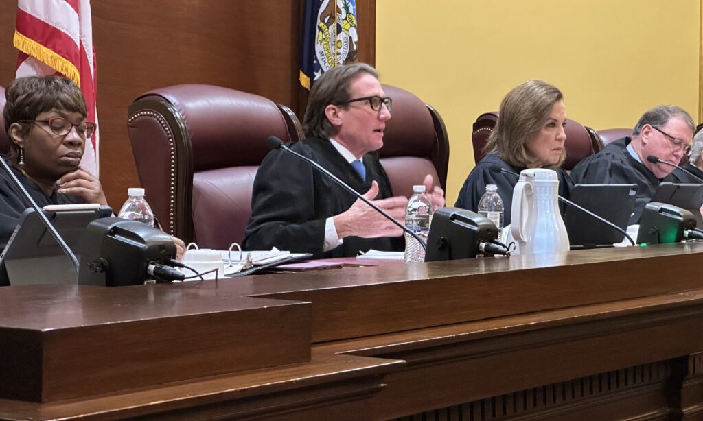 Missouri Supreme Court Judge W. Brent Powell, second from left, questions attorneys during arguments in February 2024 in a case challenging the Missouri Senate district map. The other members of the court shown are, from left, Judge Robin Ransom, Chief Justice Mary Russell and Judge Zel Fischer (Pool photo by David Lieb/Associated Press).