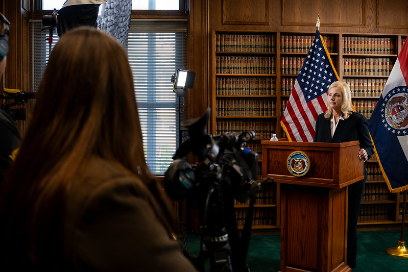 Missouri Attorney General Catherine Hanaway speaks to the media shortly after being sworn into office on Sept. 8, 2025 (photo courtesy of the Missouri Attorney General’s Office).