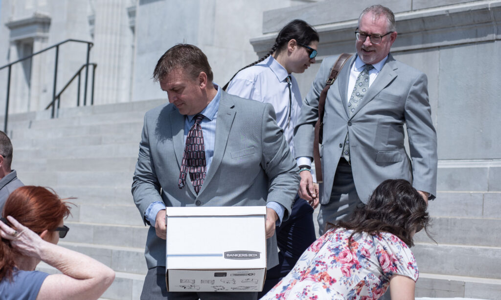 Brian Riegel, Missouri Hemp Trade Association treasurer, picks up a box of letters opposing a House bill that advocates say would eliminate the hemp industry (Annelise Hanshaw/Missouri Independent).