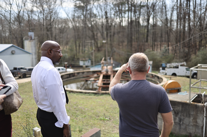 U.S. Sen. Raphael Warnock, a Georgia Democrat, in March visits a wastewater treatment facility in the city of Social Circle that the city says would be overwhelmed by plans to convert a warehouse to house up to 10,000 immigration prisoners. The city locked the facility’s water meter, forcing the Department of Homeland Security to consider trucking out sewage and bringing in water. (Photo courtesy of U.S. Sen. Raphael Warnock)